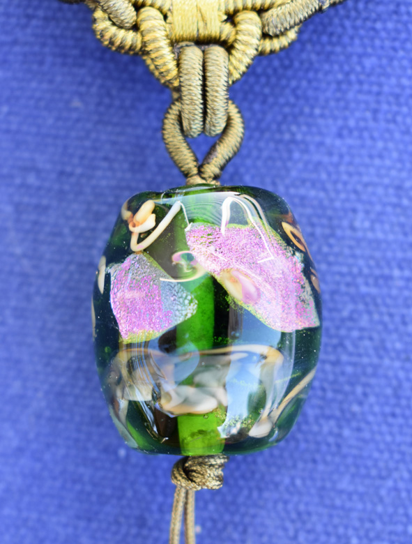 The large pendant bead pictured here on the right is a different style, with pieces of pink dichroic glass captured beneath the glass and swirls of other coloured glass as decoration. Working with molten glass can be very challenging, especially when trying to copy the beautiful beads of those world-famous Murano bead makers! I didn’t achieve anything any where near the craftsmanship of the Murano bead makers, but I learned a lot and enjoyed the experience.